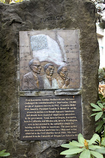 The “Justice” stone honors Fred Korematsu, born in California, Gordon Hirabayashi, born in Washington, and Min Yasui, born in Oregon. These men challenged the constitutionality of Executive Order 9066, which allowed 120,000 people of Japanese ancestry to be imprisoned. Yasui, Korematsu, and Hirabayashi were arrested and the cases against them were not overturned until 1972 in a court action that led to the Civil Liberties Act of 1988.